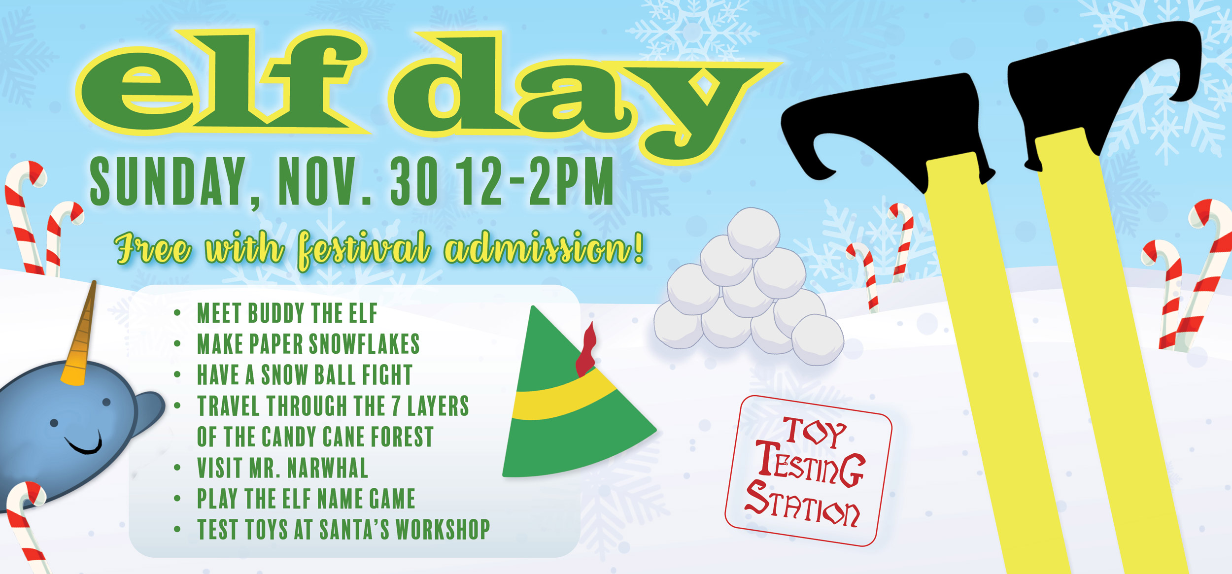 Don’t be a cotton headed ninny muggins! Spread some Christmas cheer with Buddy the Elf, have a snowball fight, make paper snowflakes, test toys at Santa’s Workshop and more! FREE with Festival Admission.